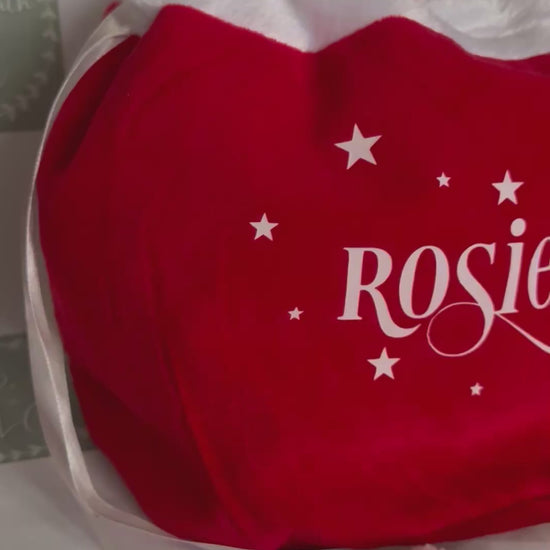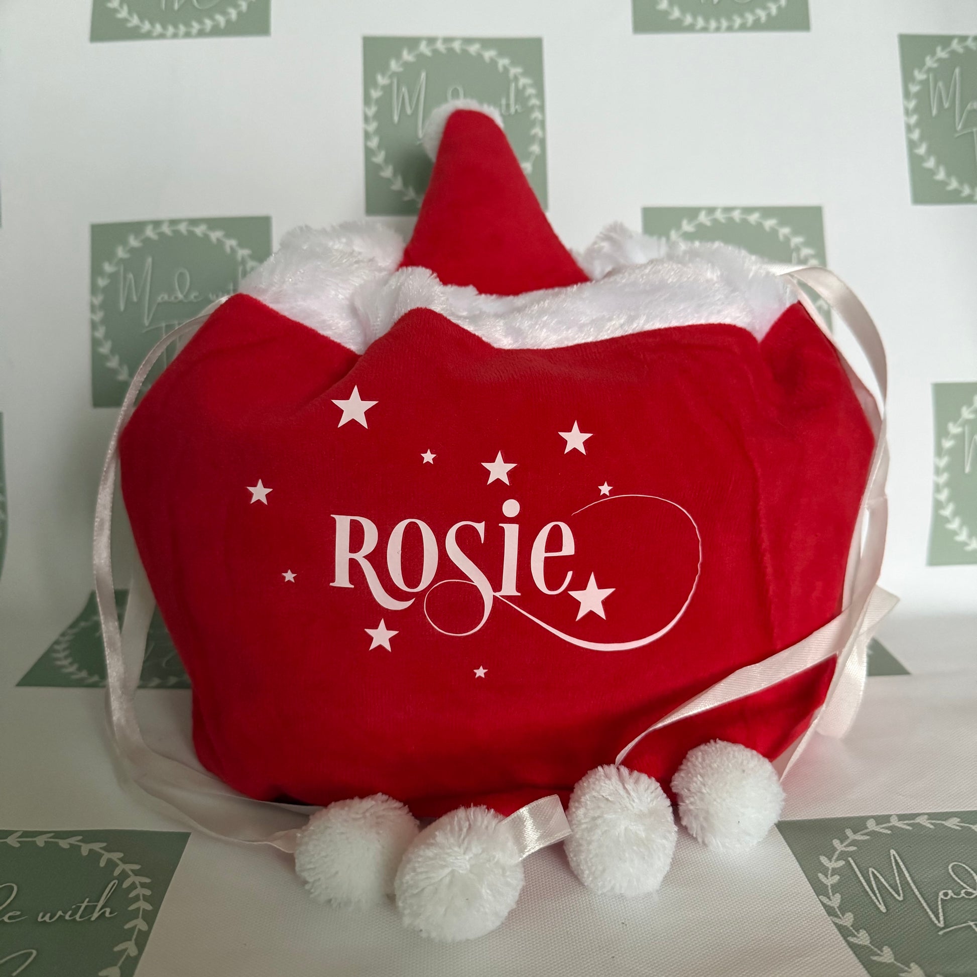 Large Santa themed velvet gift bag, with contrasting white fur. With Pom Pom detail ties and Santa hat at bag. Item can be personalised